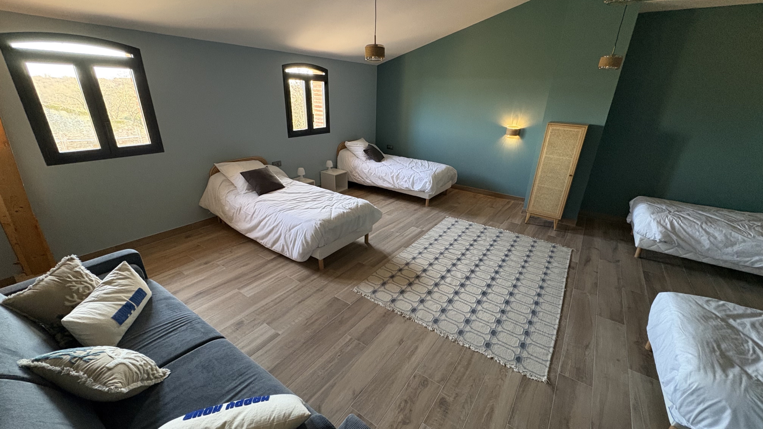 Le Clos de Galou propose un hébergement spacieux et entièrement rénové, idéal pour les séjours en famille, entre amis ou pour accueillir des groupes en quête de confort et de convivialité. Avec une capacité totale de 14 couchages, chaque espace a été imaginé pour offrir une atmosphère à la fois chaleureuse, élégante et fonctionnelle.