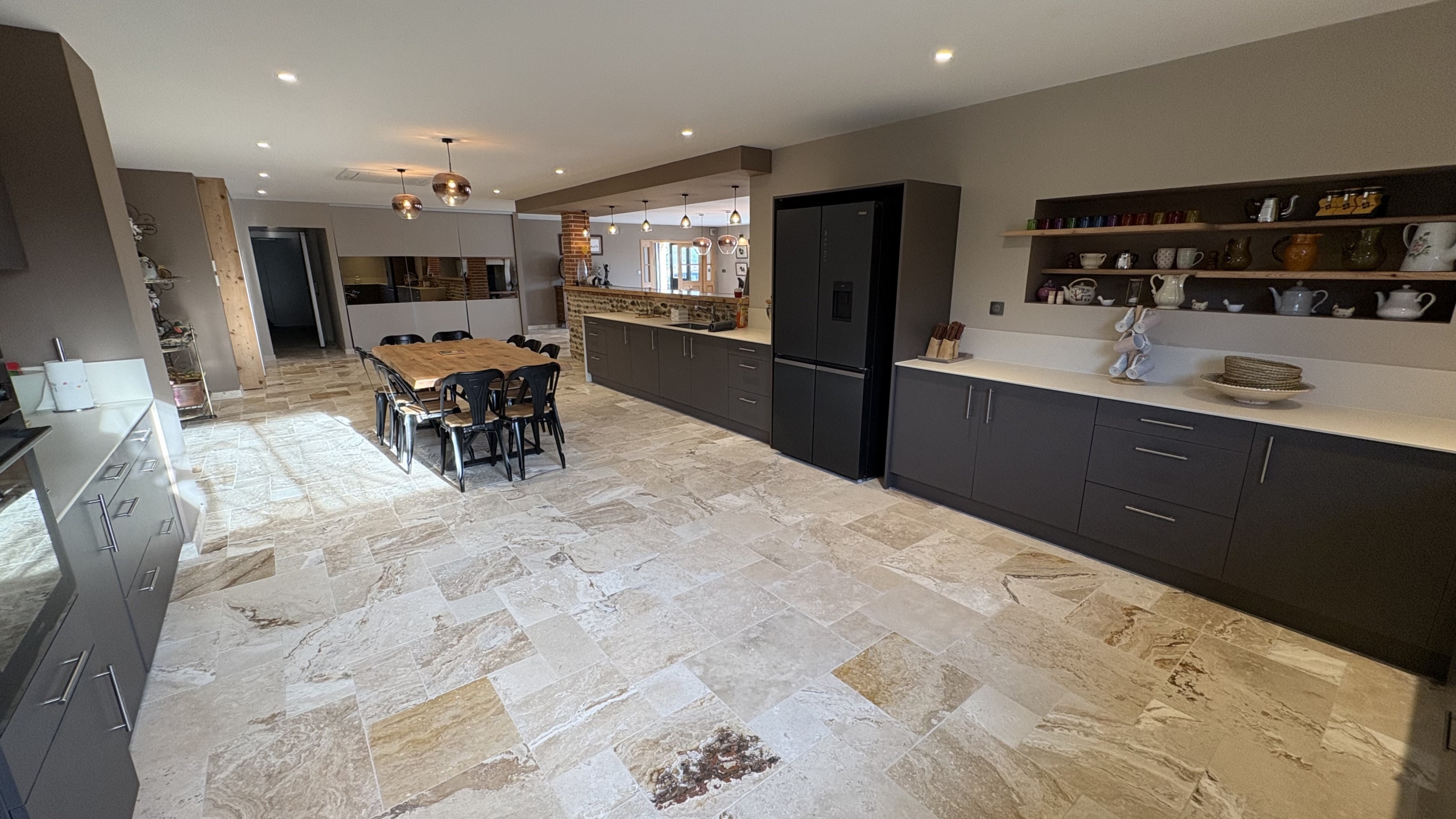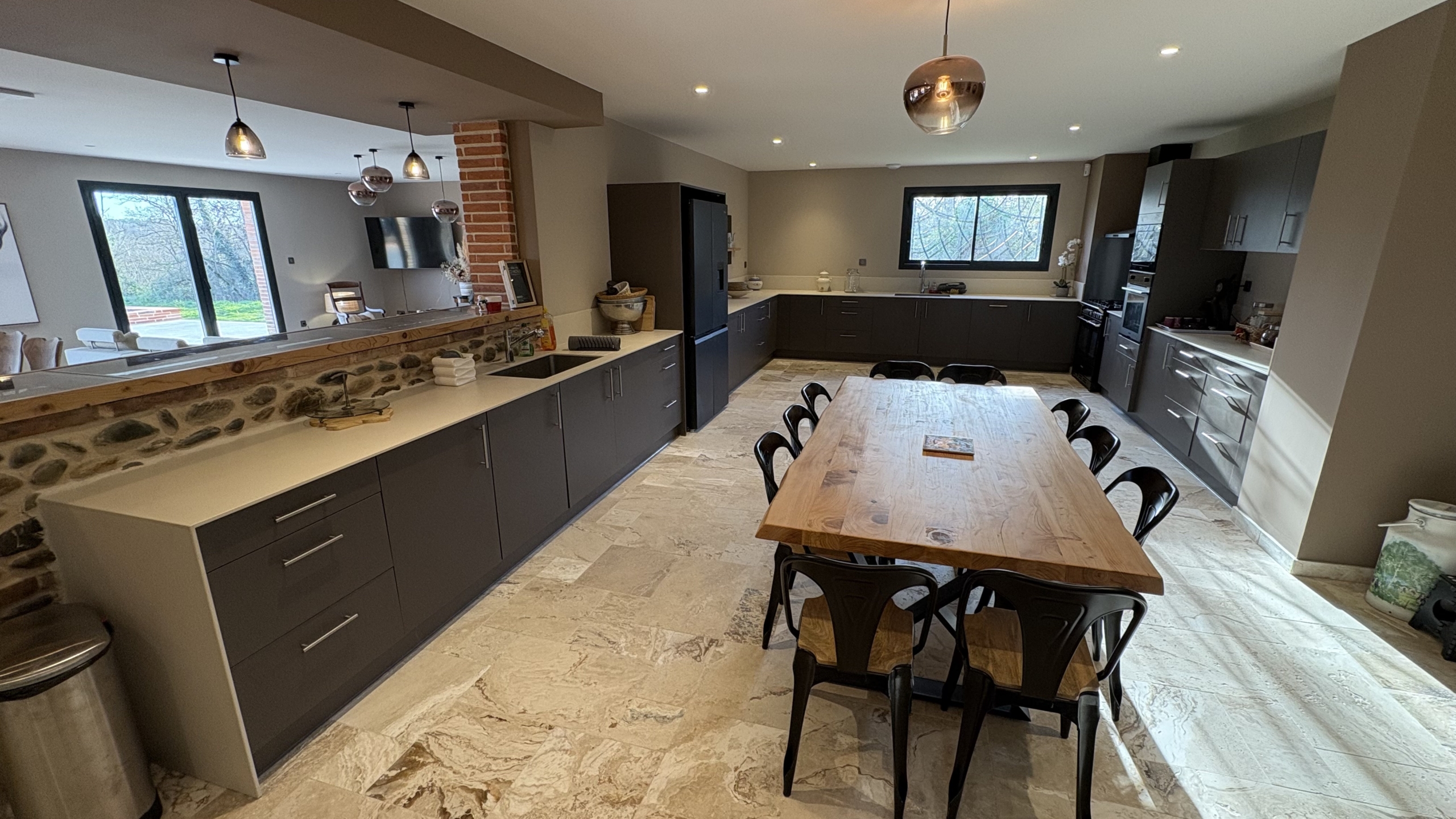 La cuisine, de grande taille, est pensée pour préparer facilement des repas pour de grands groupes. Elle dispose d’une table pratique pour cuisiner, partager un petit-déjeuner ou simplement profiter d’un moment autour d’un café.