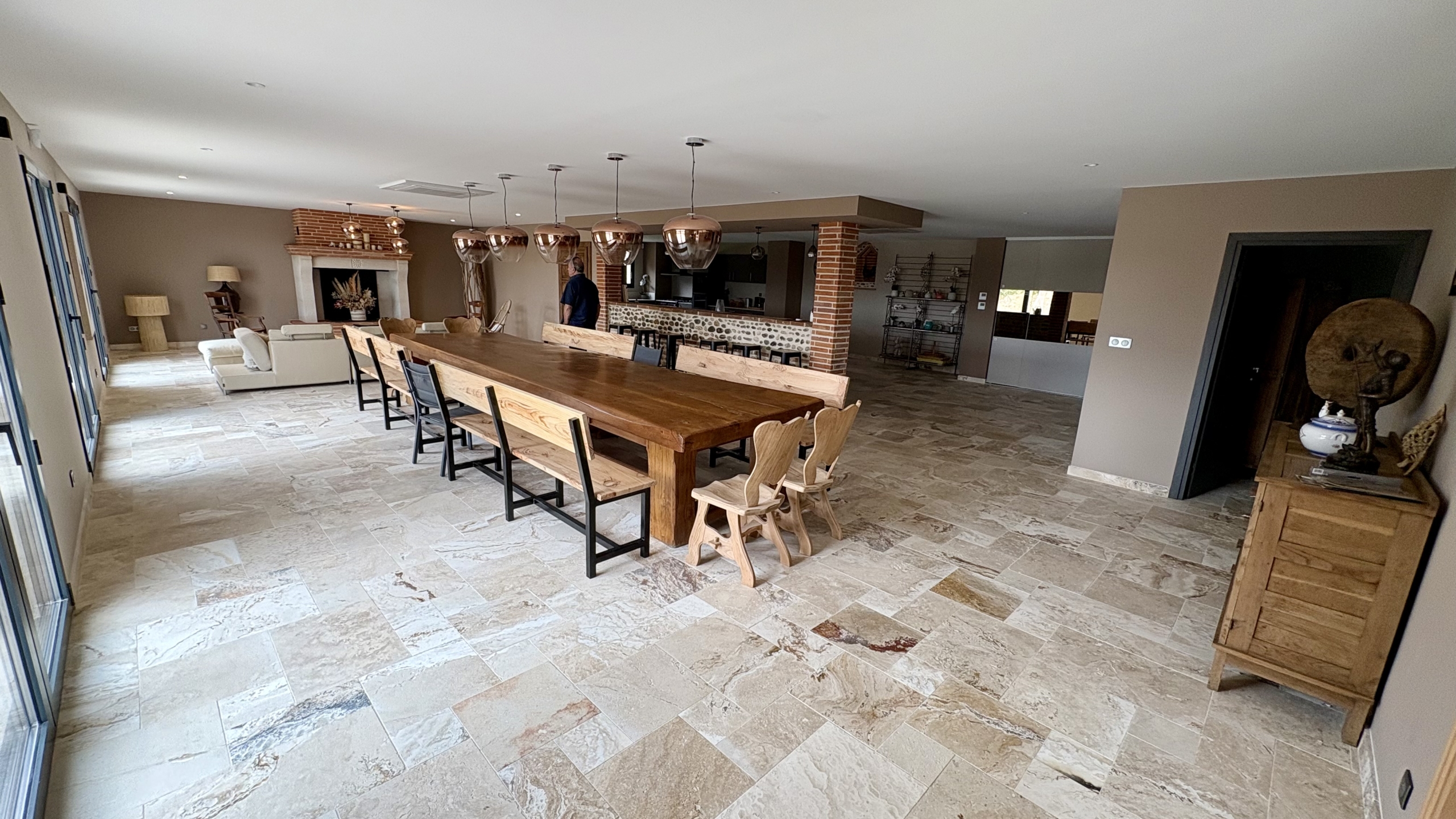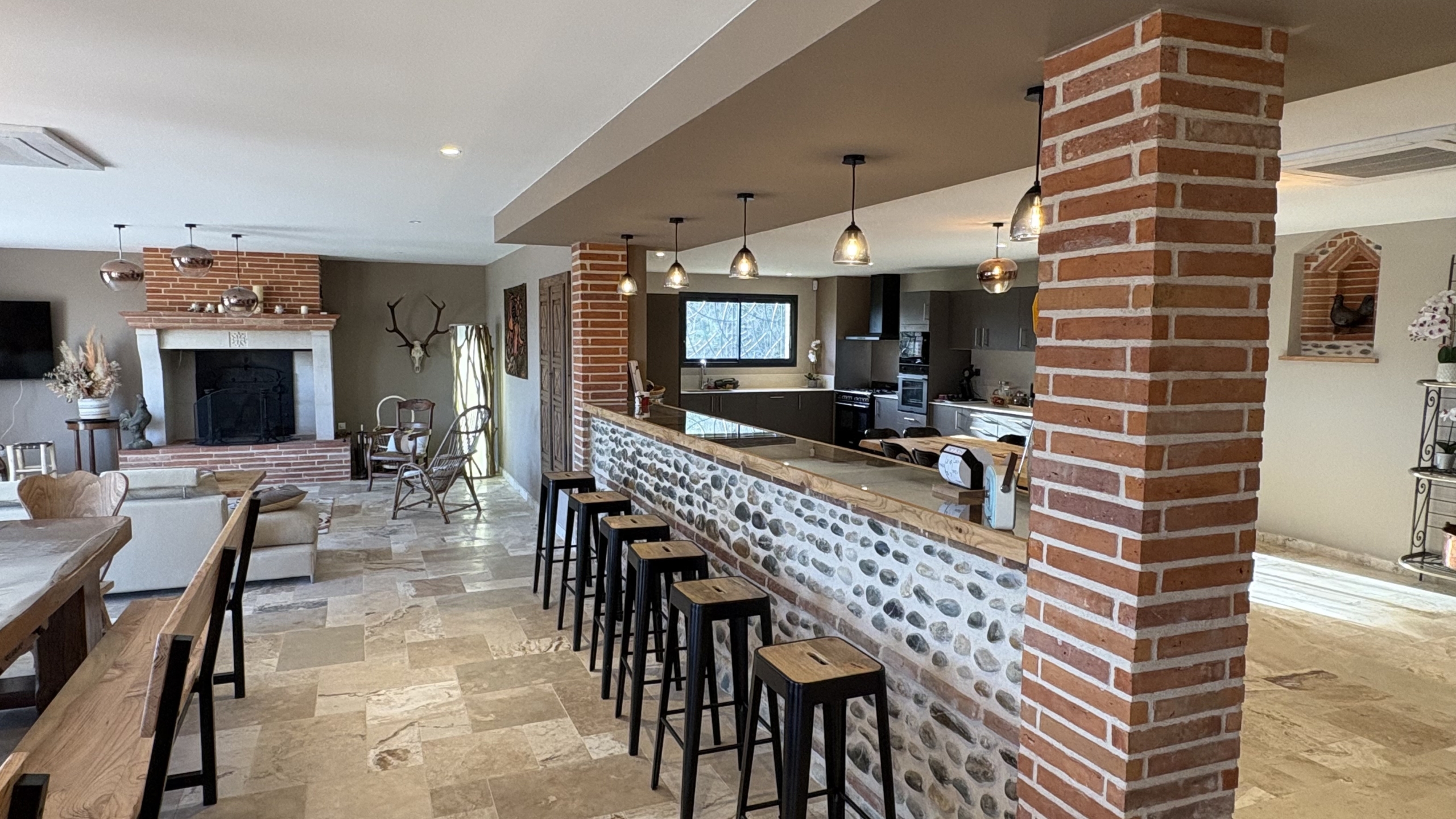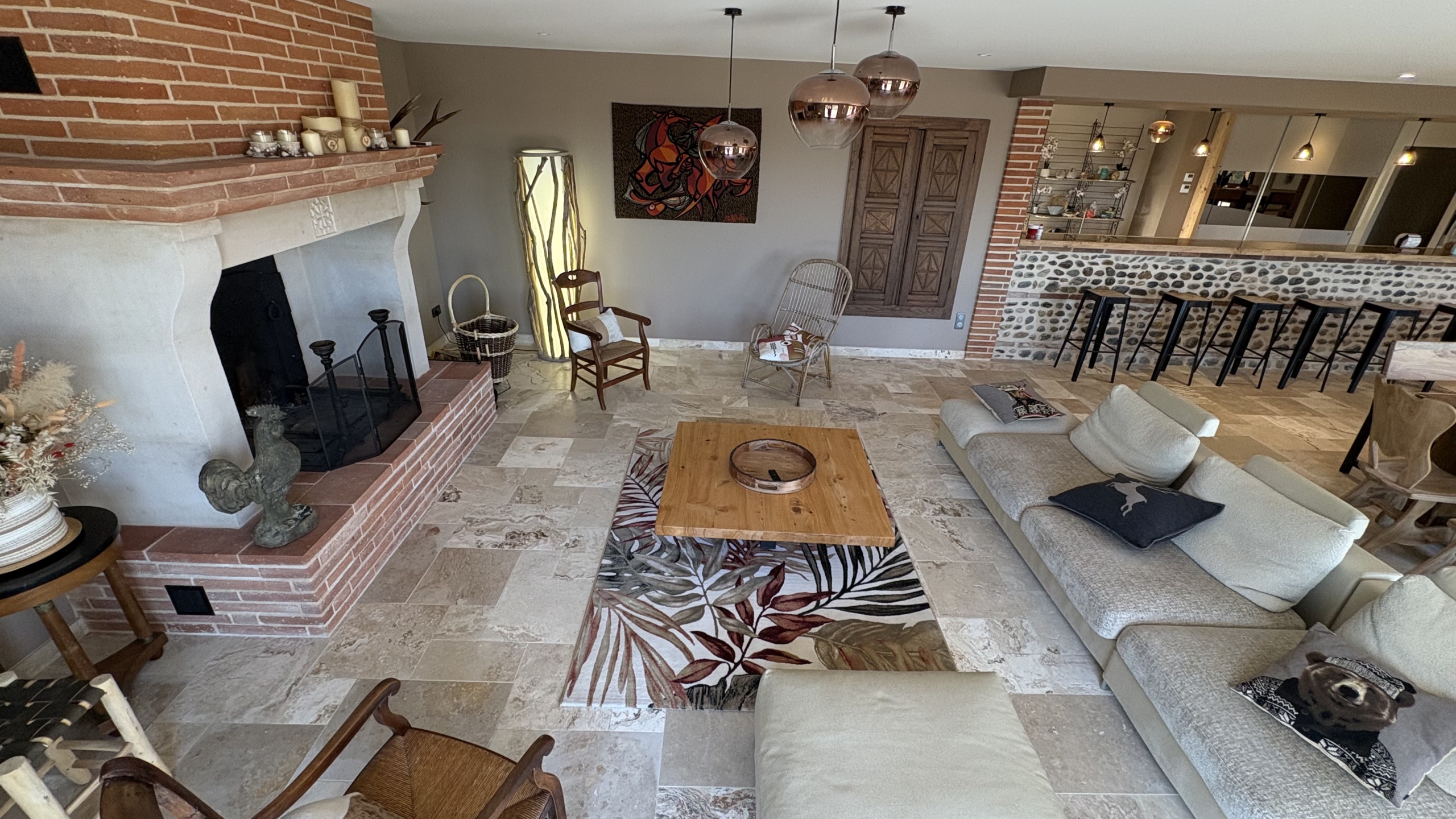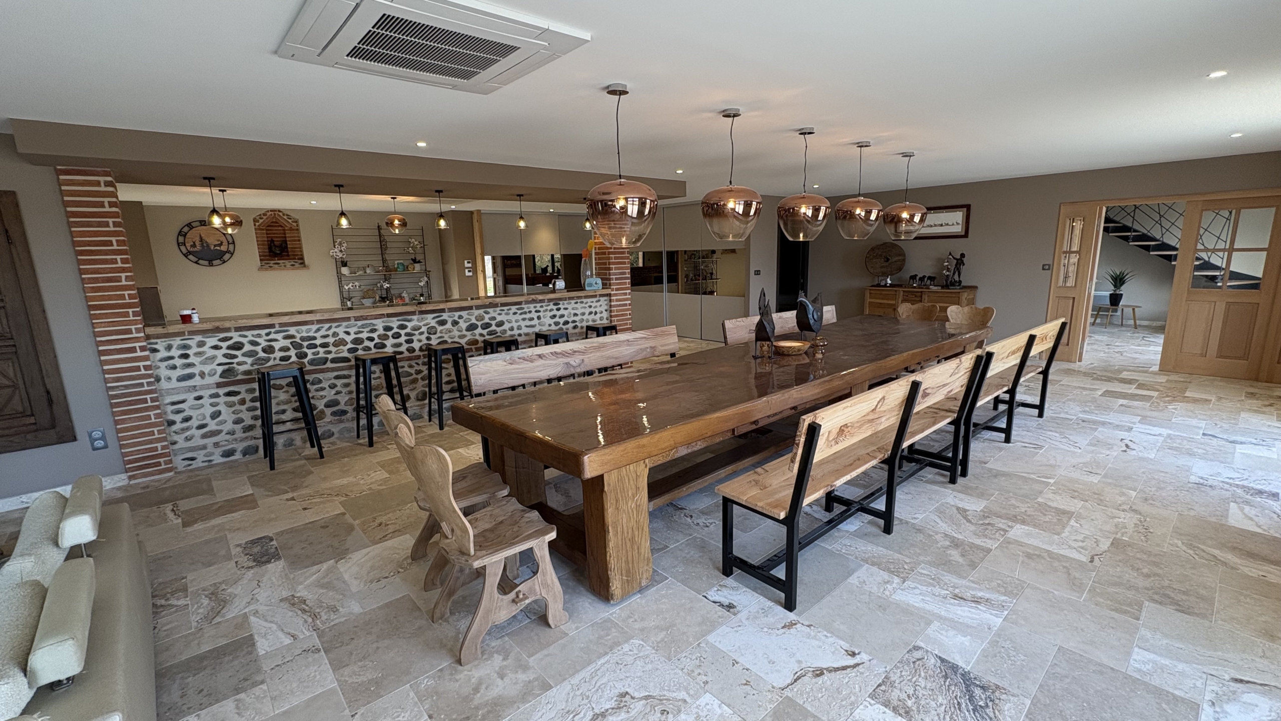 Un superbe coin bar, équipé de hauts tabourets, crée une atmosphère unique où l’on aime se retrouver pour un apéritif, un café ou une conversation en fin de soirée.