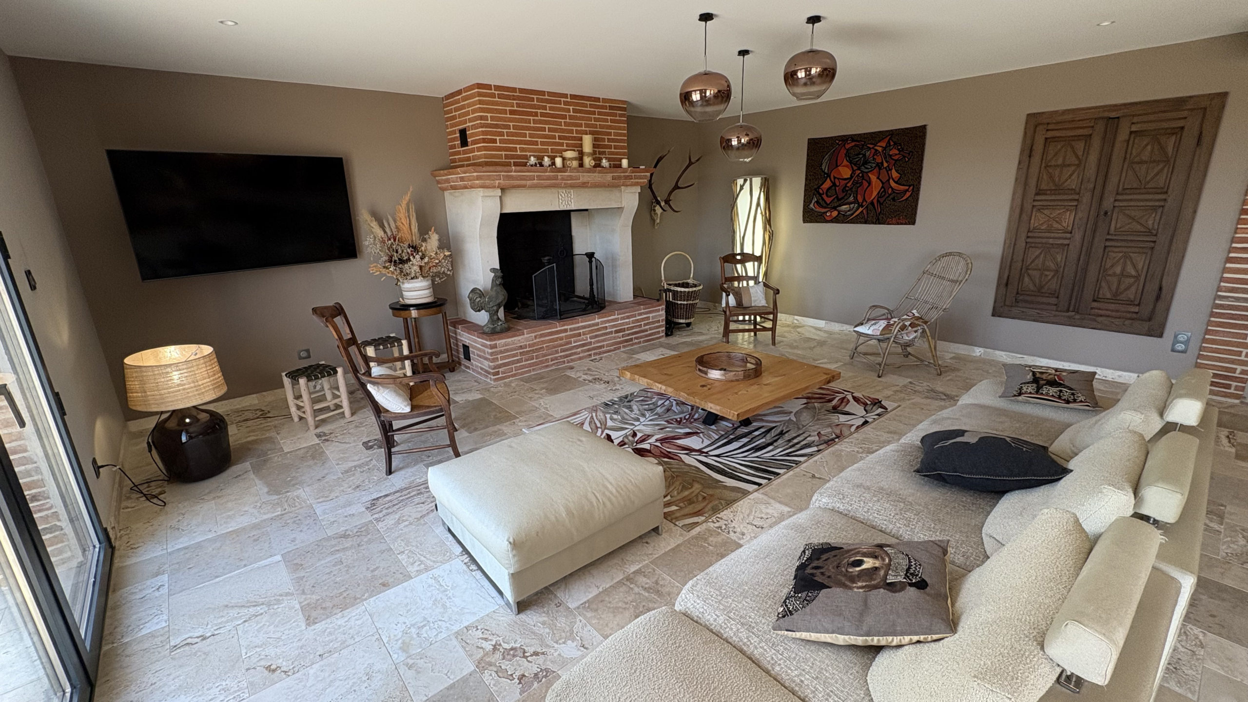 Canapés, fauteuils et télévision composent un espace cosy, parfait pour les soirées au calme, les discussions prolongées ou un moment de repos après une journée de découverte.